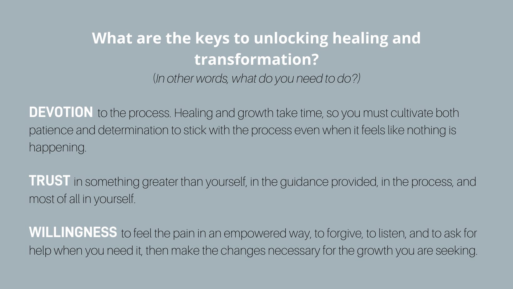 When you enter any type of program, there are commitments required if you want to succeed: a willingness to be open and learn, accountability, trust in the process, and to deepen your understanding of yourself.