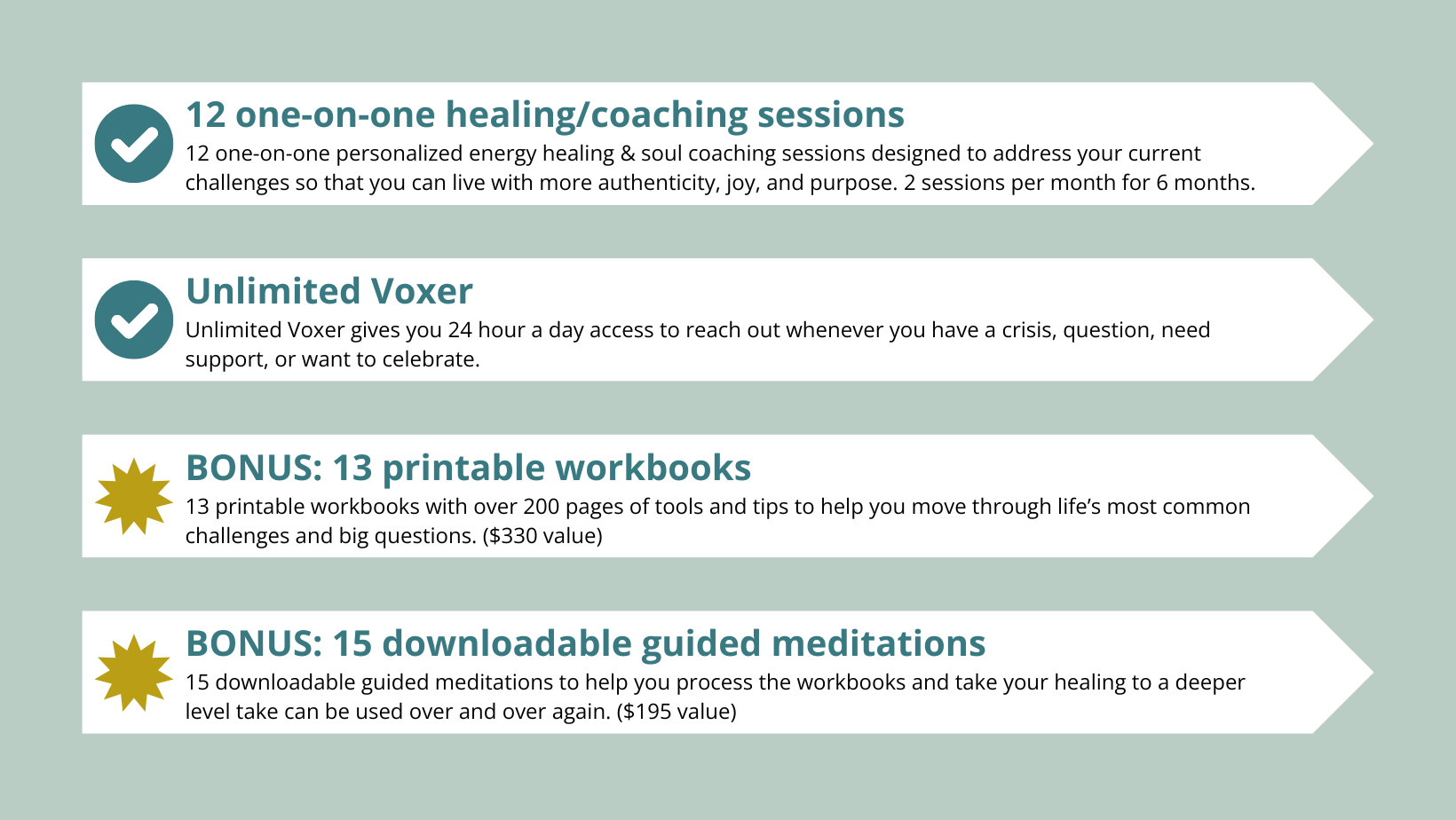 Twice a month we will meet in-person or on Zoom. The sessions will include discussion about where you currently are and what you want followed by soul coaching, channeled guidance and/or energy healing. Each session will be unique to you and what is best for you in the moment. You will also have unlimited Voxer access, you will be able to send messages and receive guidance anytime in between your sessions to address any resistance coming up or “homework” you’ve been given.